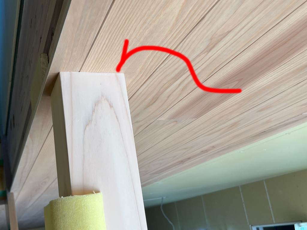 このお家のインテリアのハイライトと言って良いでしょう。 LDKの天井は全部木の板をはります いまは半分くらい貼ってますね