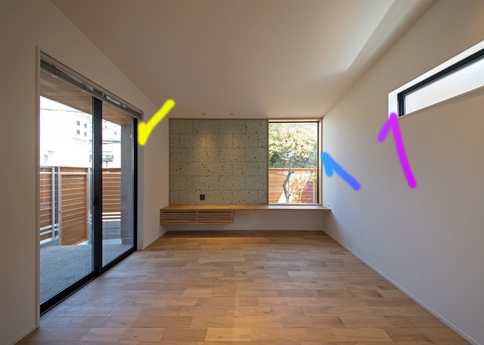 ここでは、正面が木の色、左右を白色の窓枠を使ってます。