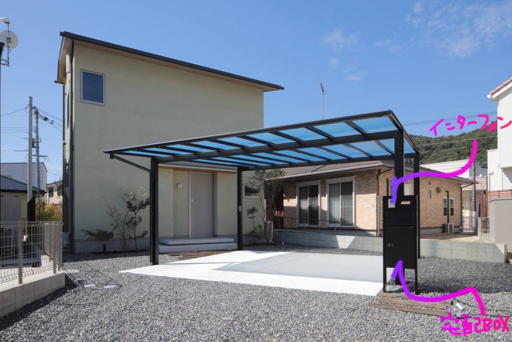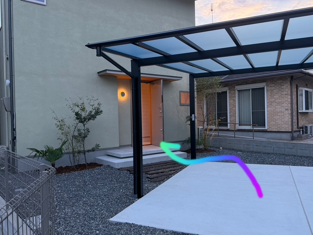 カーポートがついた感じです。 車寄せのような感じでレイアウトしてますので 今日のような雨の日には、車から濡れずに家の中に入れることで 特にありがたみを感じてもらえるはず。