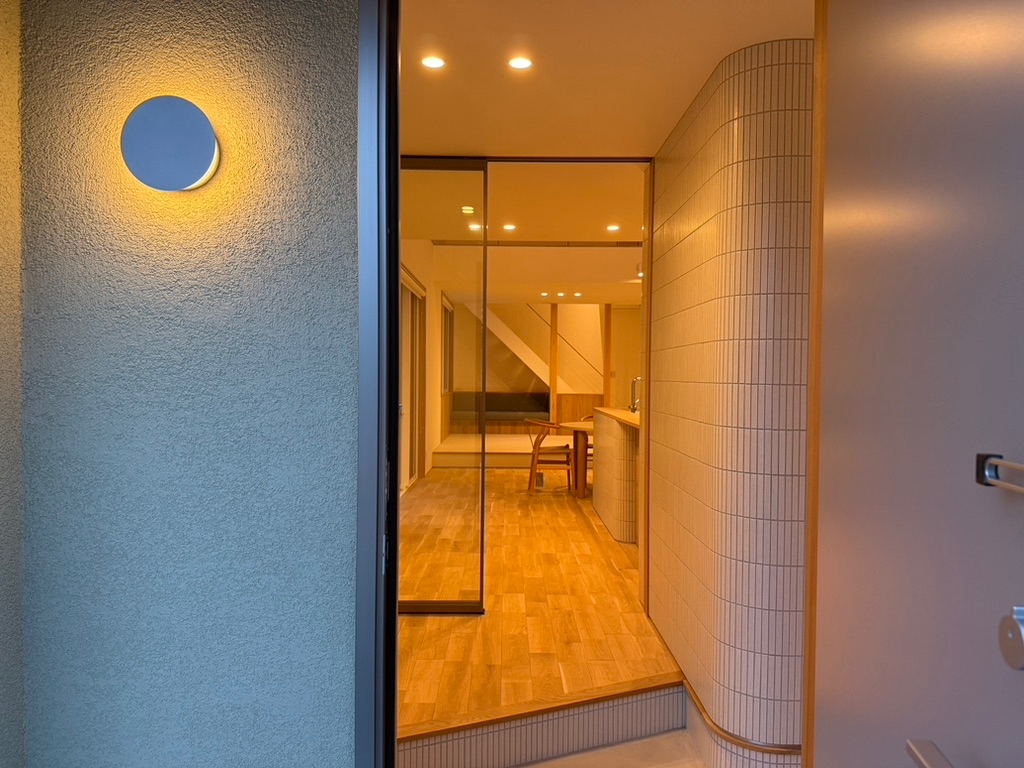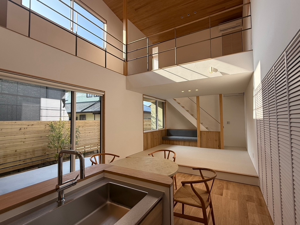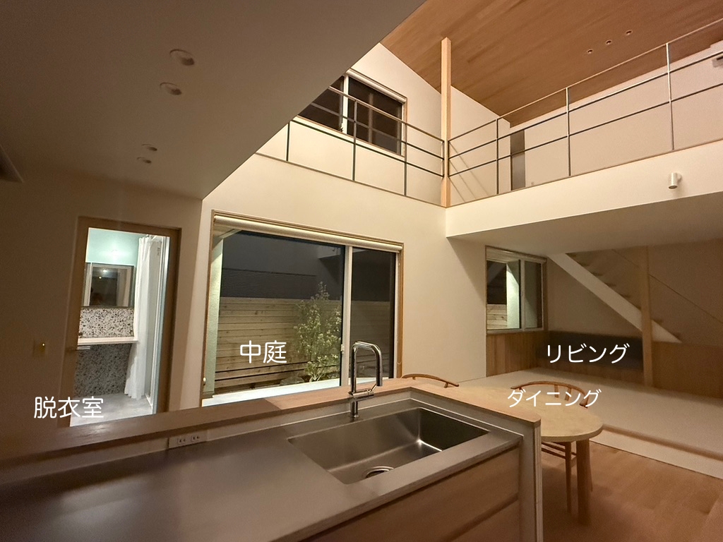 キッチンから、庭、脱衣室、吹き抜け〜リビングをのぞむ