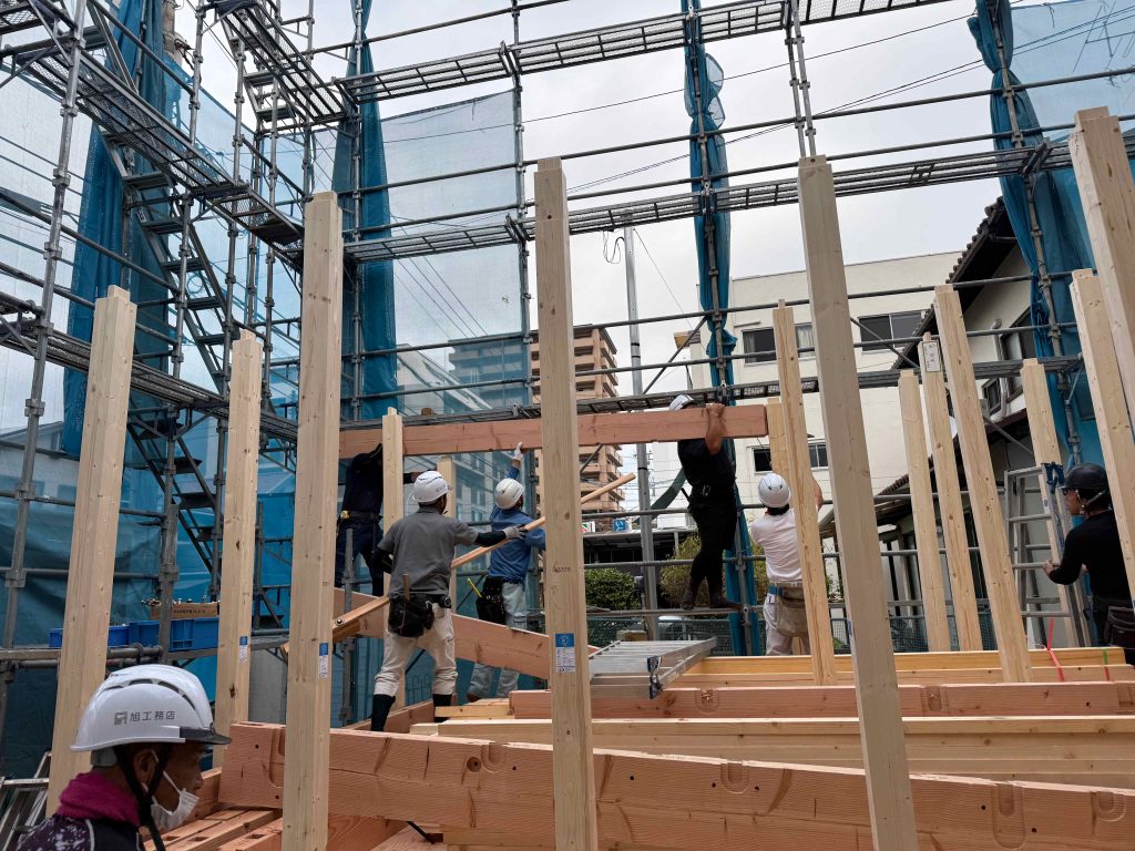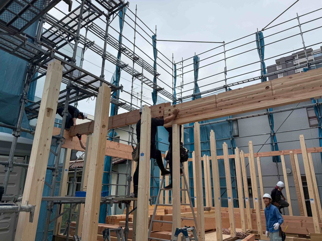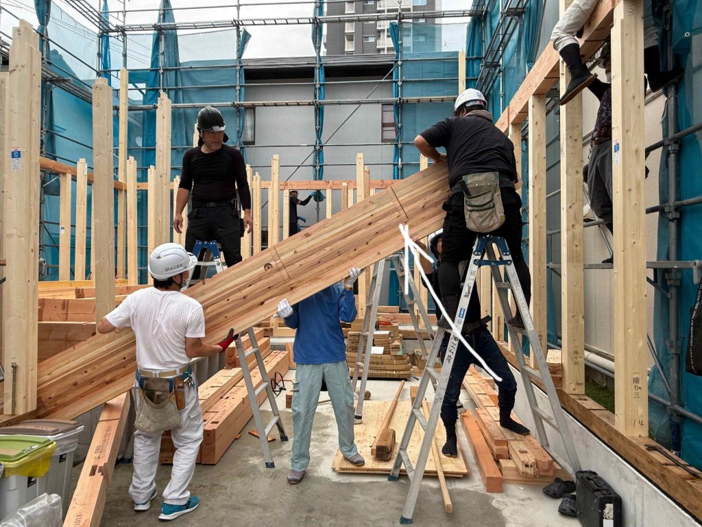 上棟しました-1。@庚午の家 プロジェクトストーリー 2025.10.15 庚午の家は、クレーン車を使いにくいロケーションということもあって、 2日かけて上棟する予定にしていて 今日は初日。(祝) クレーン車を使わないということは、 当たり前ですけど、人力で材料を持ち上げます こんだけ大きな梁になると、 なんぼ力持ちの大工でも、 ちょっと苦労されてました。 とりあえず、今日の作業は終了・ 明日は雨っぽいのでまた明後日、 つづきやらせてもらいます Prev Next 一覧へ戻る