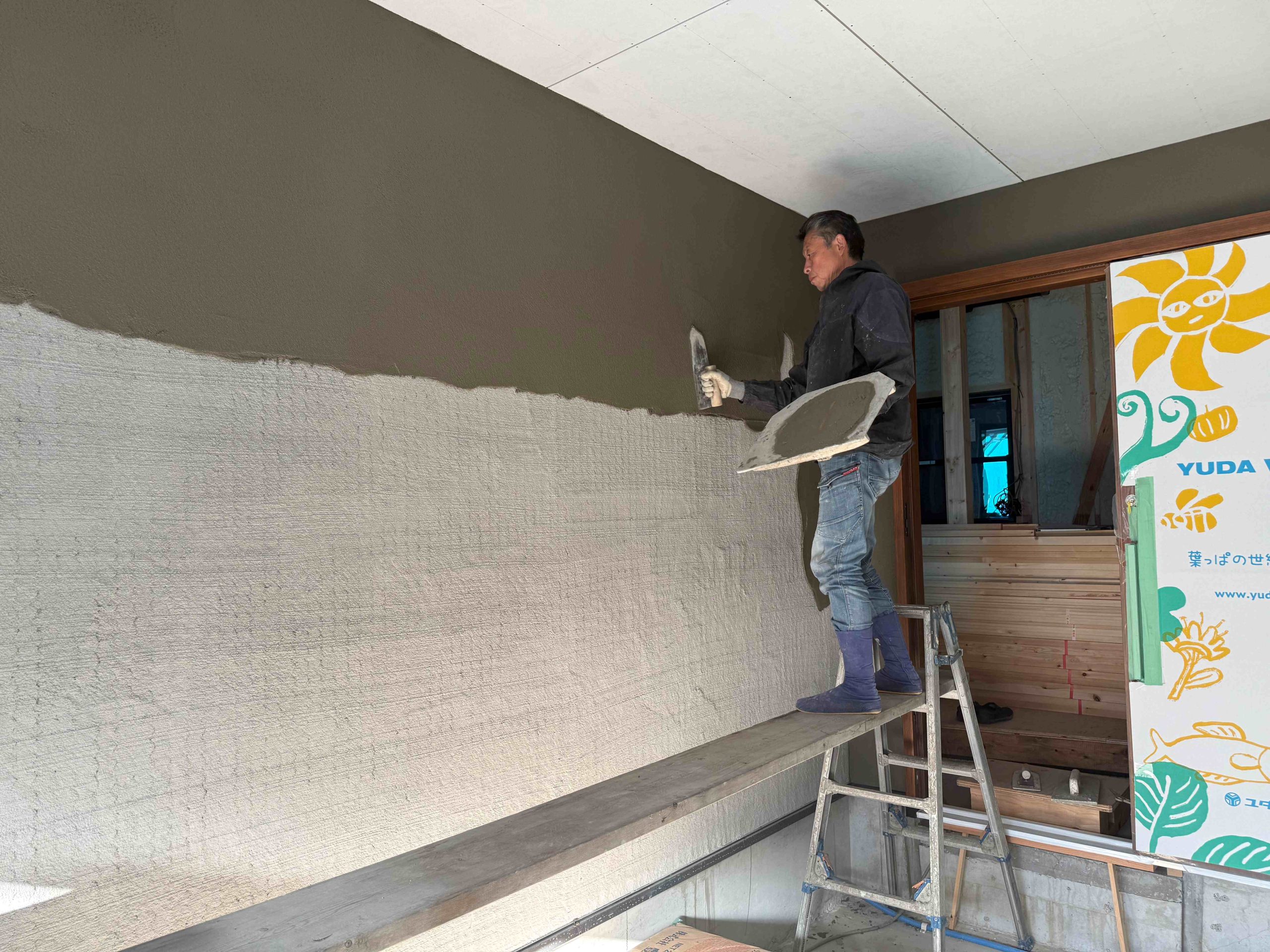続。外壁をつくってく@庚午の家 プロジェクトストーリー 2025.12.28 #左官 モルタル、粗コスリ後 仕上げ塗りの感じです。 見てると、簡単そうに洗練された動きで さっさと塗っていかれるんですけど、 このシゴトは、本当に難しいんです。 小さなホールケーキのスポンジの上に 生クリームを塗るのも すごく難しいことだと思いますけど、 もっと広い面を塗ってくわけですから、、 たぶん それ以上に難しいシゴトだと思います。 Prev Next 一覧へ戻る