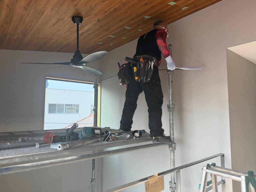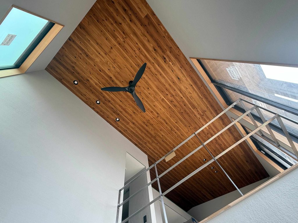天井扇@庚午の家 プロジェクトストーリー 2026.04.02 #シーリングファン いろいろ機器をとりつけているところですが 吹き抜けの照明と天井扇(シーリングファン)です。 吹き抜け部の壁の仕上げや、天井の仕上げ、機器付けのために 足場を設置していましたが 足場をバラすと、、 こんな感じで スッキリしましたね^ Prev Next 一覧へ戻る
