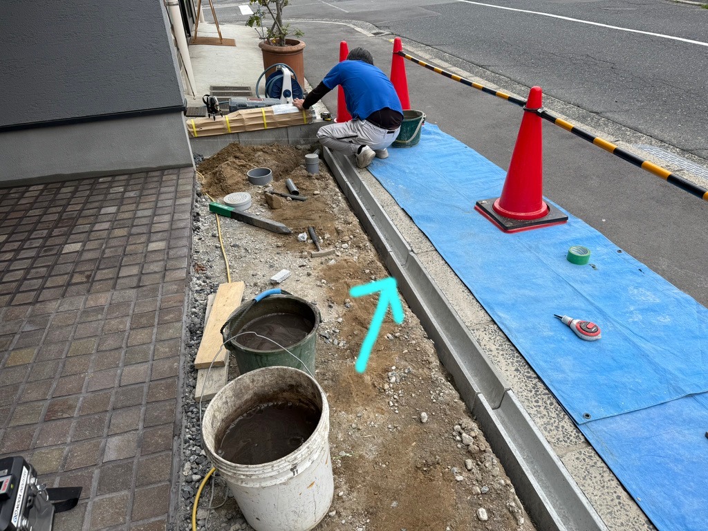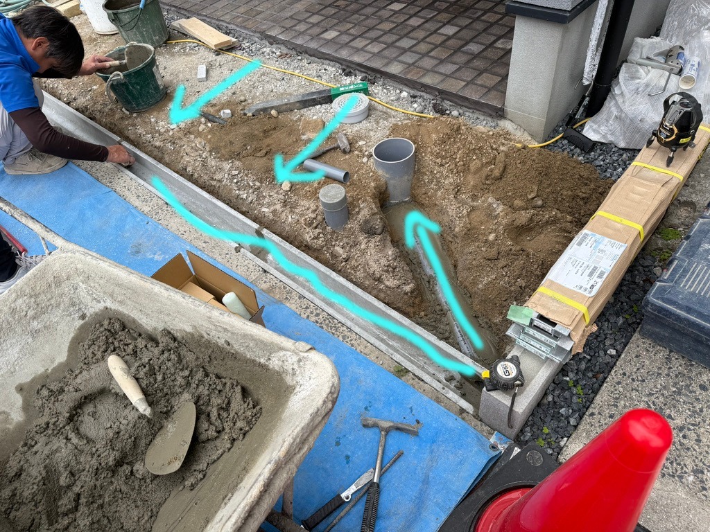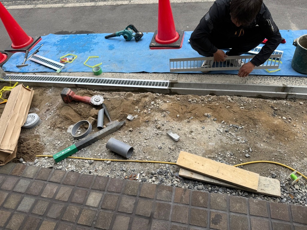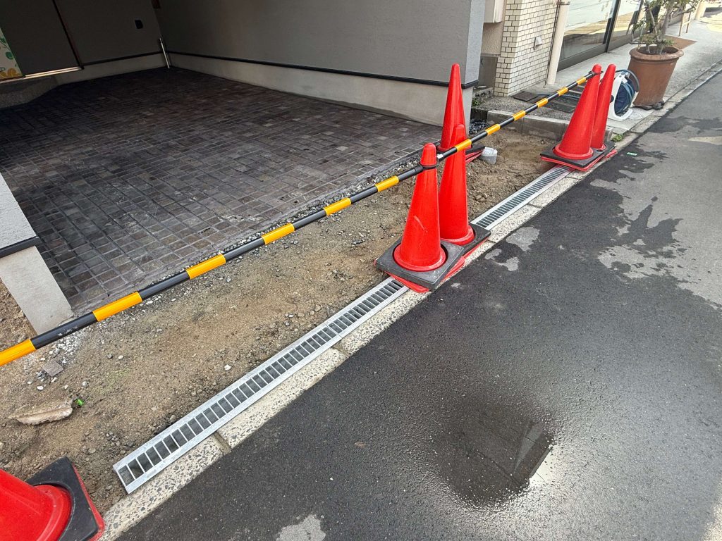 土間排水@庚午の家 プロジェクトストーリー 2026.04.18 #外構 道路と、敷地の間に、なにやら埋めてますね。 これ、U字溝っていうんですけど 土間排水のための材料です。道路の側溝とかでも使ってます。 それの小さいやつ。 水の通り道をつくって、、 鉄製のふた(グレーチング)をつけます。 こんな感じで完成。 車庫のなかで洗車をすると、 これが無いと、道路にそのまま水がいっぱいながれます まぁ、普通の家(駐車場)はそうなんですけど、 そこらへんを気にするかどうかは、 その人次第ですよね Prev Next 一覧へ戻る